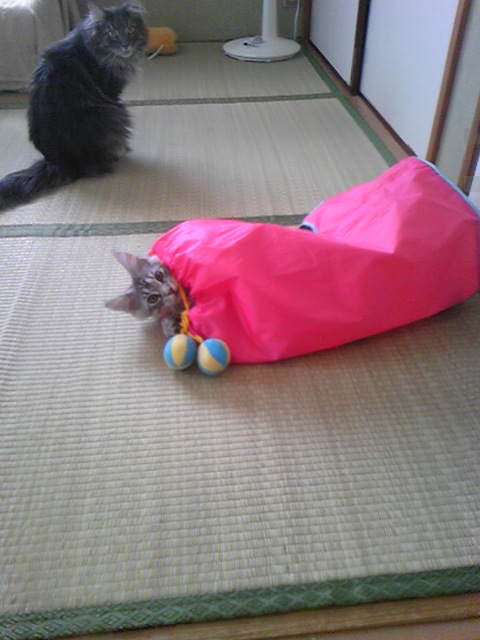 でも朝晩冷えるので、猫の部屋をのぞくとこんな茶番が・・・おやおや。