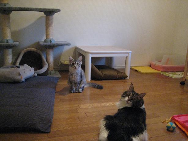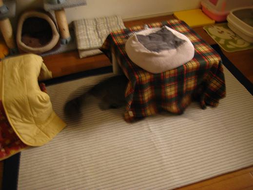 猫部屋には猫用こたつと、電源のはいってない人間用コタツがあります。